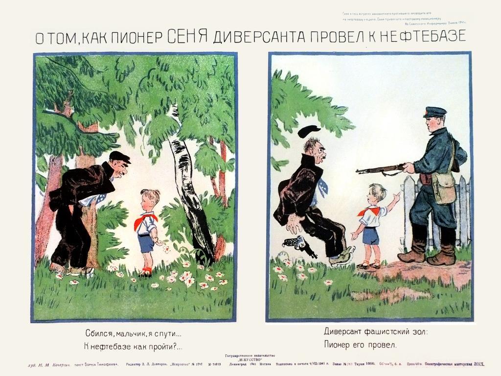 В вечерней сводке Совинформбюро за 2 июля 1941 года рассказывается история мальчика Сени, разоблачившего немецкого диверсанта, который собирался взорвать стратегически важные объекты. Этот случай художник Николай Кочергин увековечил в «Окнах РОСТА», а затем она разошлась по всей огромной стране в тысячах плакатов.